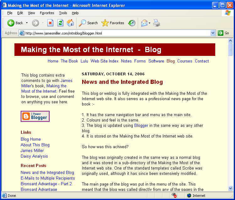Although it is simple and understandable to all, the book is not aimed at idiots or dummies. It is aimed at those who feel that for the health of their business or the improvement of their personal life, they need to understand and embrace the wonderful technology of the Internet. The contents is available on the web site, whilst several of the first few chapters can be previewed as a PDF or Adobe Acrobat document. All have been designed for printing as A5 portrait and all copies will either be spiral bound or in a ring binder. The web site also contains a blog, which is updated with new techniques and warnings on the latest scams. Note that the blog has been designed as a fully integrated part of the web site. Similar techniques can easily be used to create a company or personal news page for virtually any web site. If you would like to see a full copy of the book or have a topic that you feel should be included, then do not hesitate to contact me. James Miller Daisy Analysis Ltd., East Green Farm, Great Bradley, Newmarket, Suffolk CB8 9LU |