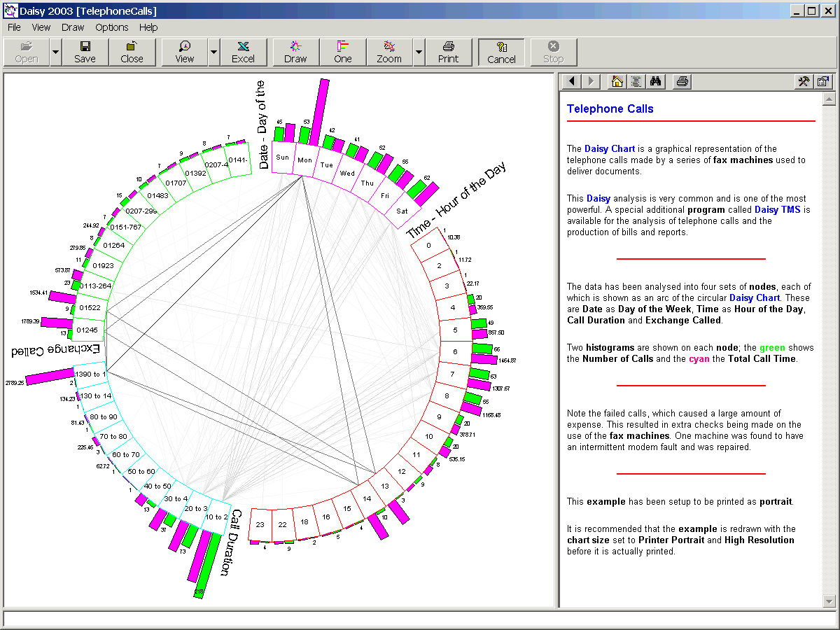 Shown is a Daisy Chart, which is a unique graphic, designed to show the maximum amount of information about a database in a single chart.